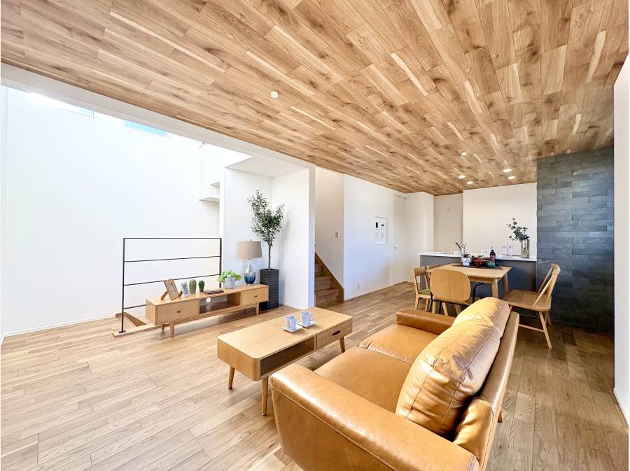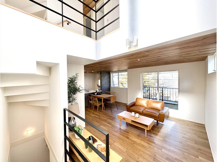 リビングの吹抜けが生む開放感が、この家の大きな特徴です。木の温もりと鉄骨手摺が調和したLDKは、デザイン性と居心地の良さを兼ね備えています。