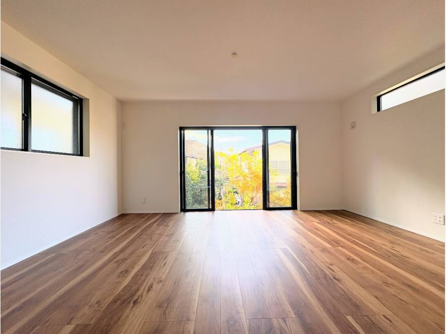 約18帖の広々としたLDKは、大きな窓が設けられた開放的な空間設計。窓の外には木々の緑が広がり、室内には自然光がたっぷりと差し込み、明るく快適なリビングを演出します。