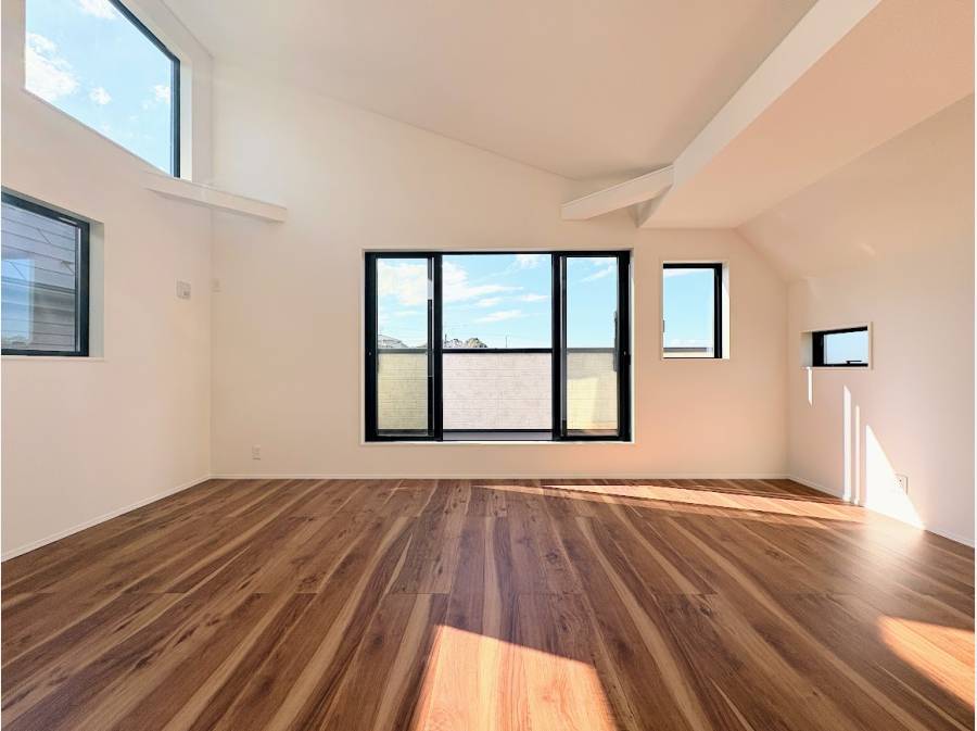 2階のLDKは勾配天井が開放感を演出し、明るく広々とした空気感が漂います。