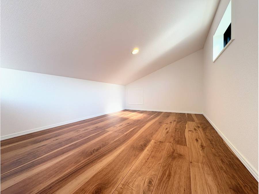 主寝室は勾配天井がもたらす広がりが魅力的で、ロフト付きのため収納や趣味のスペースとしても便利です。朝日が差し込む中で、心地よい朝を迎えられる空間が広がります。