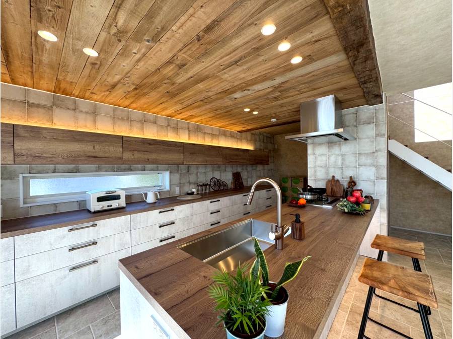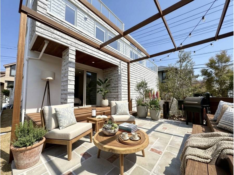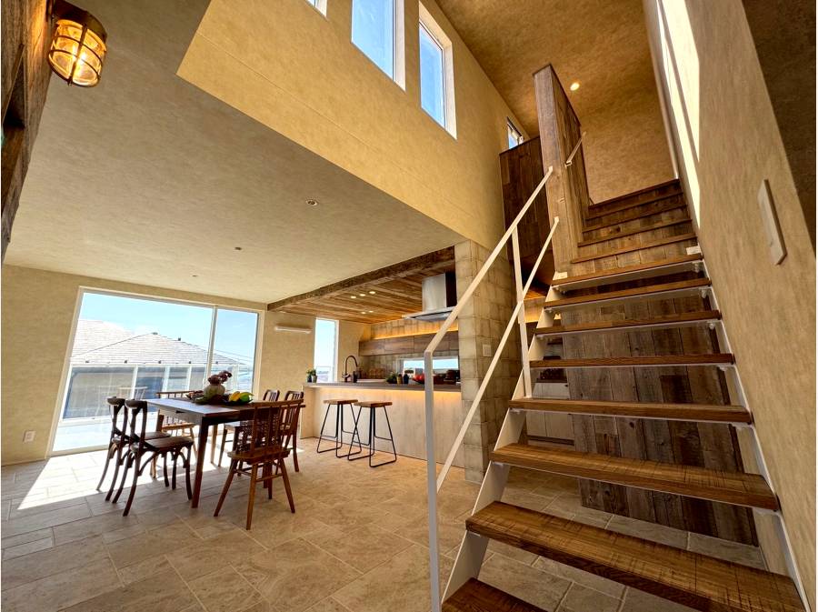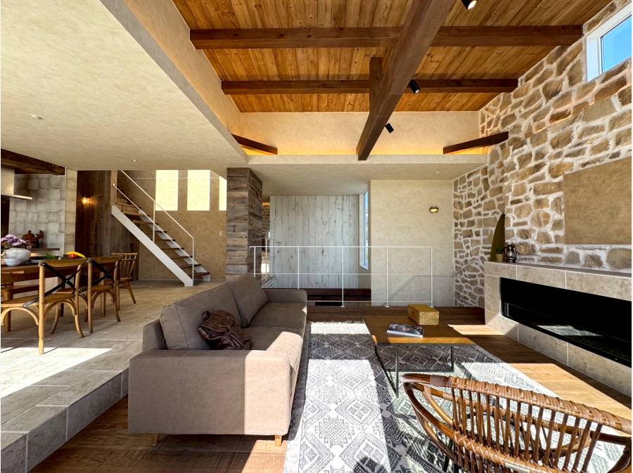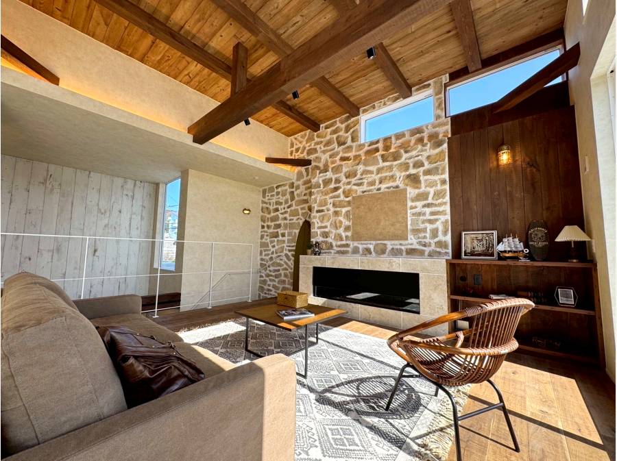 湘南の穏やかな住宅街、七里ガ浜東に誕生したBarn Styleの邸宅。古材の風合いを活かした木の温もりと、石壁が印象的なリビング空間。吹き抜けのある開放的な設計が、自然光と心地よい風を住まいの奥まで届けます。屋上バルコニーからは湘南の海を望み、空と海が広がる贅沢な時間を日常に。デザイン性と居心地の良さを兼ね備えた、湘南らしいライフスタイルを叶える住まいです。