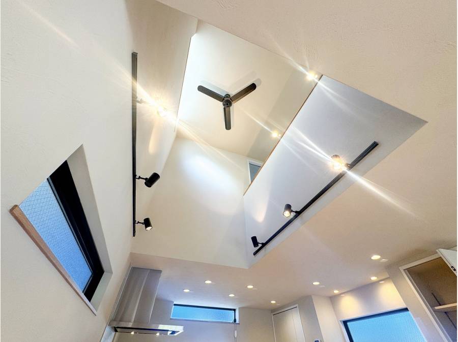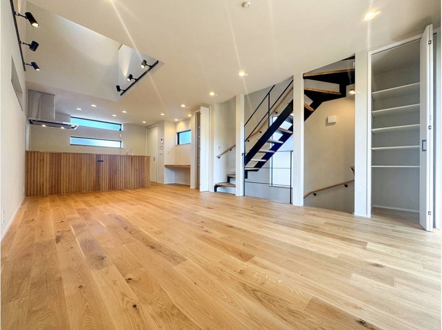 約21帖という広さに加え、天井の吹抜けやブラックのアクセントが際立つスケルトン階段など、デザイン性の高い開放的な空間が広がります。