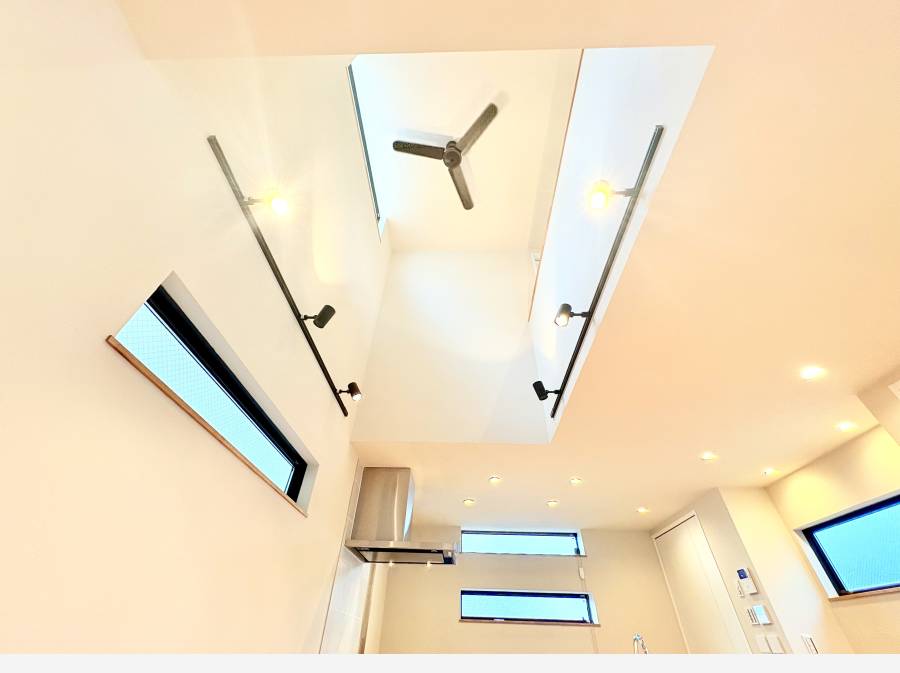 約21帖のリビングは、南側にウッドデッキが続いており、広々とした開放感があります。随所に窓を配置することで風の通り道を確保し、心地よい空気の流れを生み出しています。プライバシーを考慮し、南側以外の窓はすべてすりガラスを採用しました。