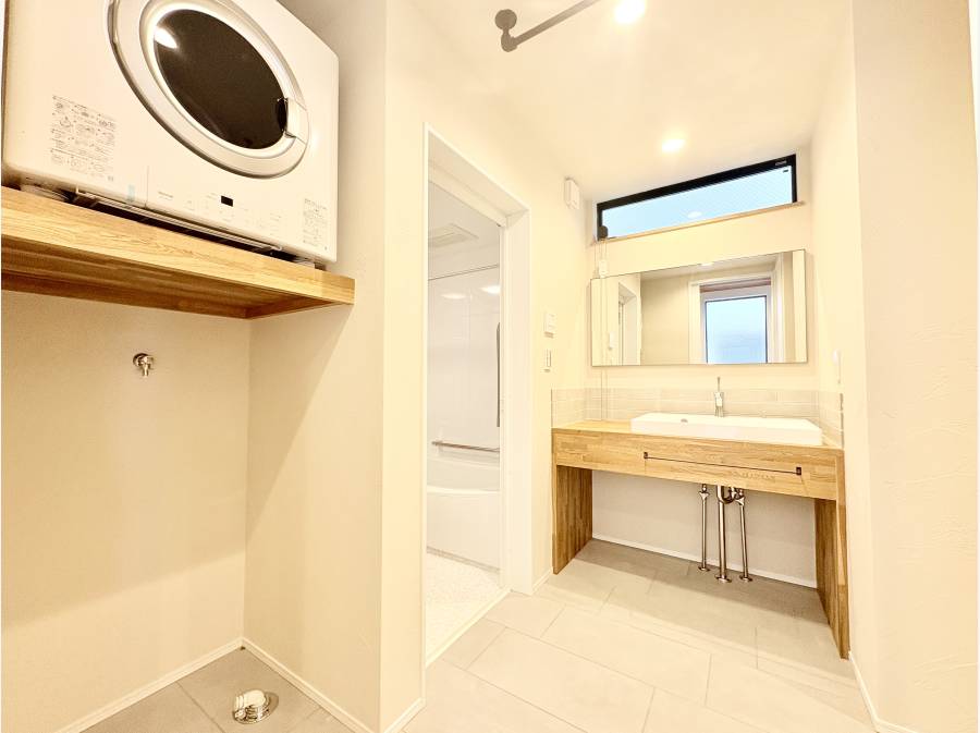 外壁はジョリパット塗りによるシンプルなデザインで統一しました。玄関ホールに入ると土間から直接水回りにアクセスできる利便性の高い動線となっています。水回りおよび玄関の床は、水はけの良いタイル張りを採用しております。