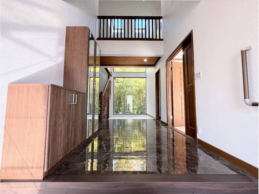 エントランスの大きな窓からは竹林の美しい眺めが広がり、鎌倉らしい静かな雰囲気が訪れる人を包みます。さらに、家屋には天然素材が取り入れられており、木の温もりを感じながら心地よく暮らせる設計です。
