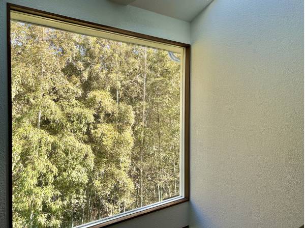 玄関ホールには大きな窓があり、その先には美しい竹林が広がります。