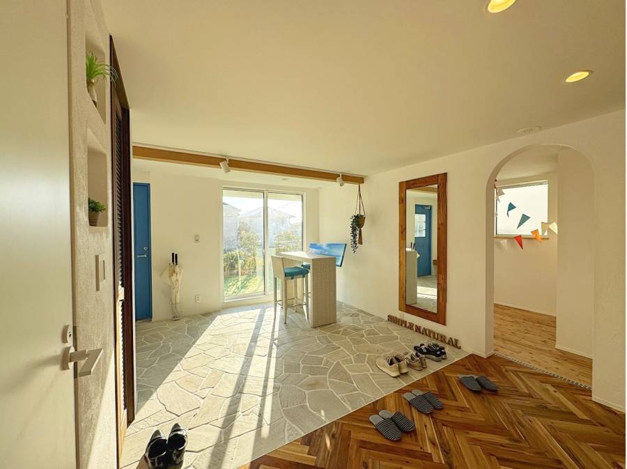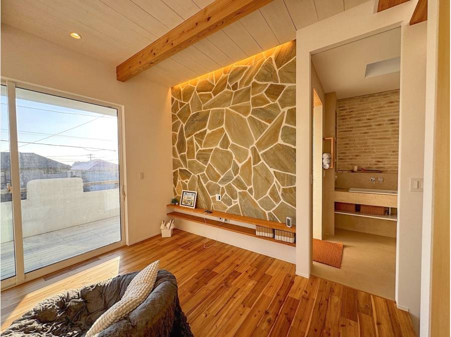 床はヘリンボーンを含む無垢板、壁は漆喰の塗仕上げとの事。