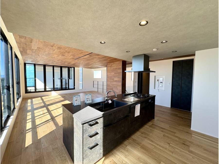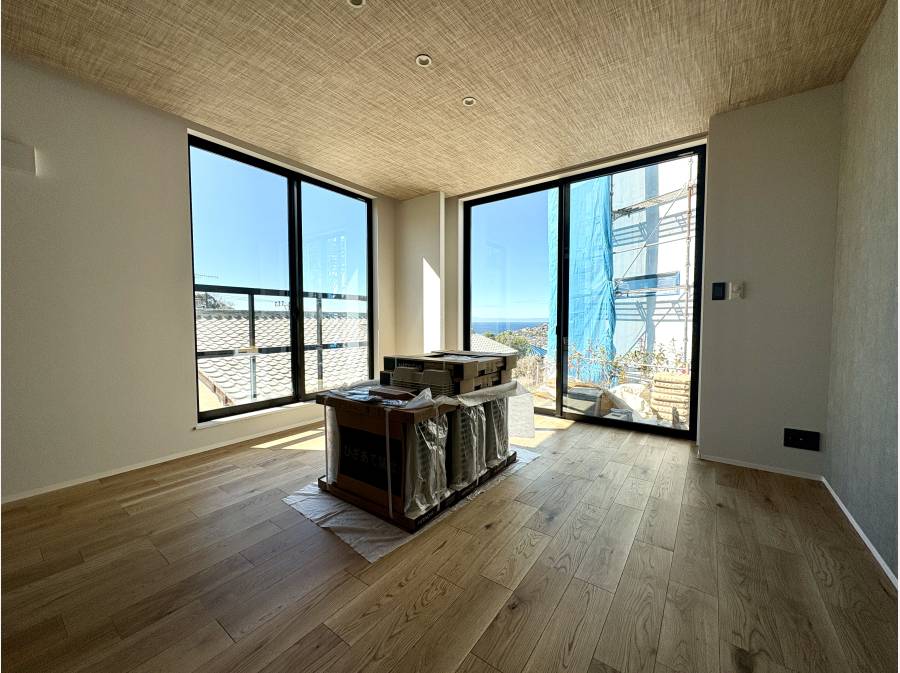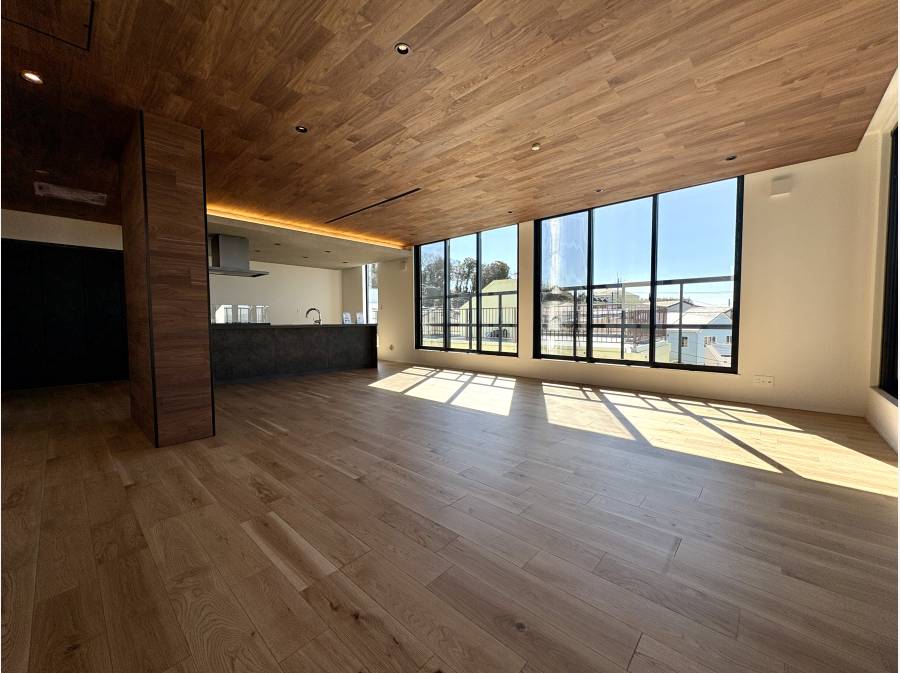 2階に設けられたリビングからは、相模湾や江ノ島を一望でき、日々の暮らしの中で自然の移ろいを感じることができます。約30帖の広々としたLDKは、天井の高さと窓の設計によって、開放感と落ち着きがうまく融合した居心地の良い空間となっています。