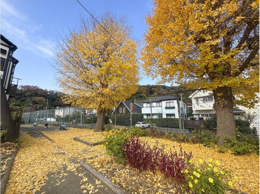 現地から小川を渡って3分ほど歩くと、逗子ハイランドの桜並木通りがあり春には素敵な景観が広がります。