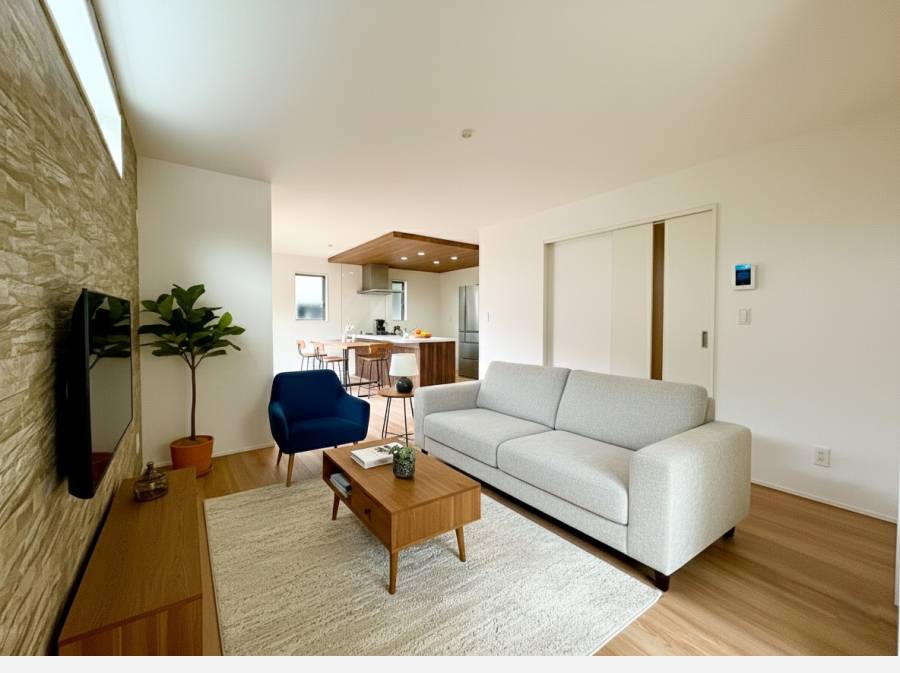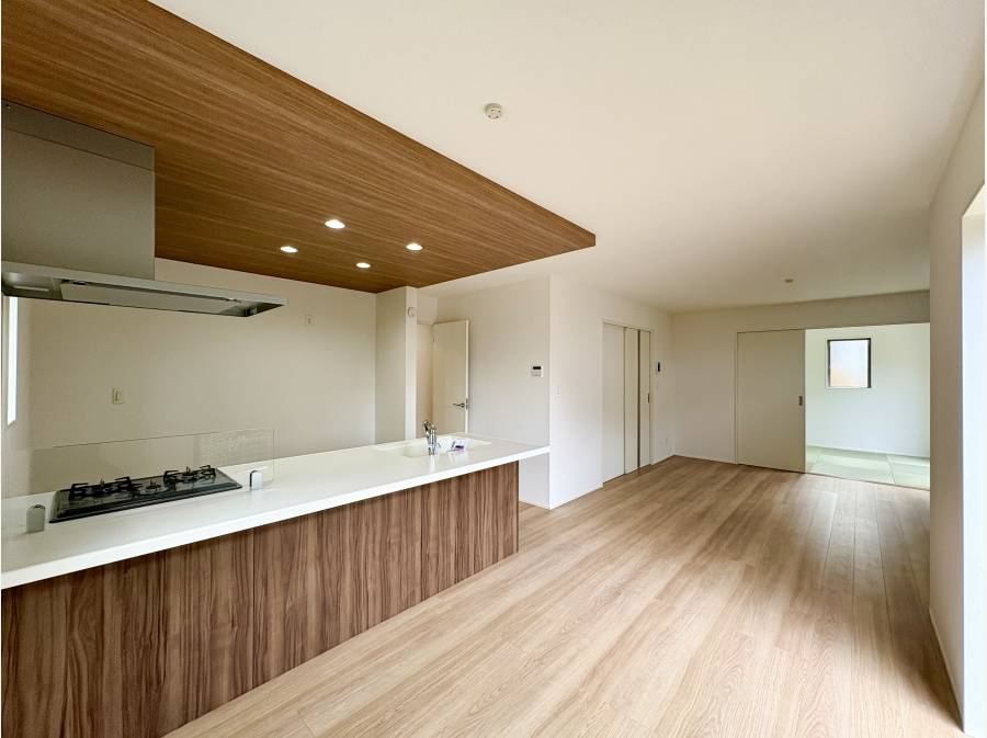 間取りは4LDKで、LDKは和洋室とつなげると約22.5帖の広々とした空間に。木目調のフロアとアクセントクロスが温かみを演出し、家具を配置することでさらにおしゃれな仕上がりになります。