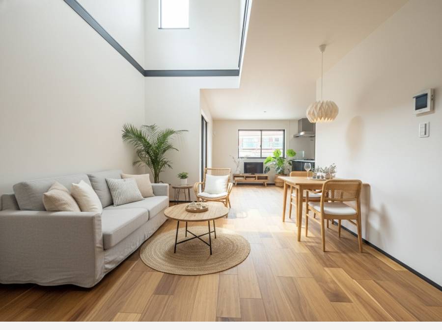 リビングは吹き抜け仕様で、柔らかな光が室内を明るく照らします。