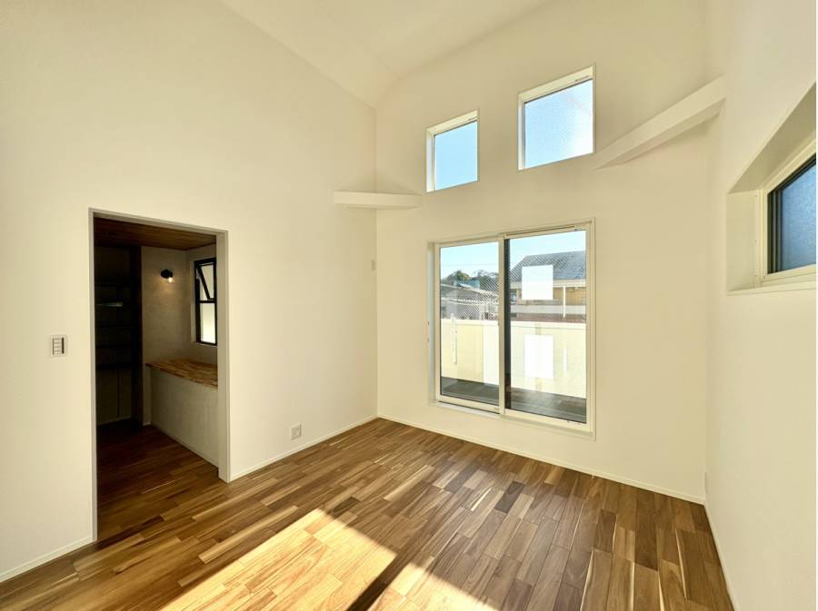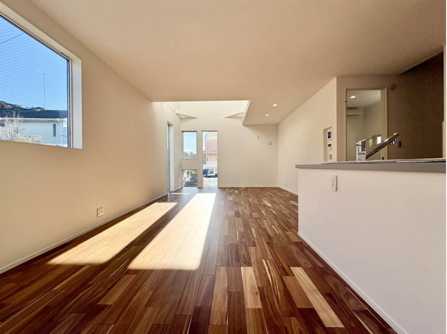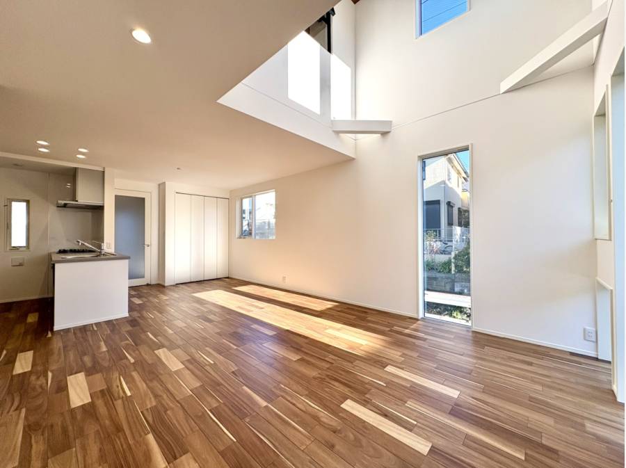 約18帖超の広々としたLDKは、吹き抜けによる開放感が魅力で、家族の会話も弾む空間です。