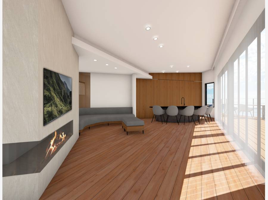 船を思わせるキッチン、そして海を眺めながら寛げるラウンジのR形状家具など、
