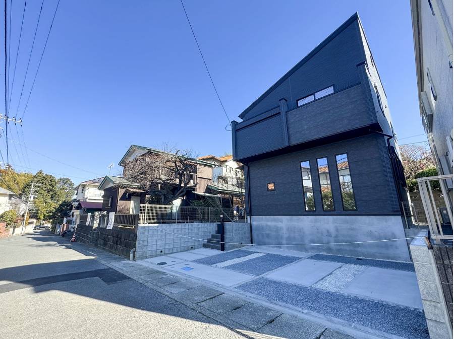 こちらのお住まいは青空にパキっと映えるオールブラックの外観が目を惹く佇まい。