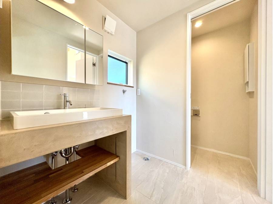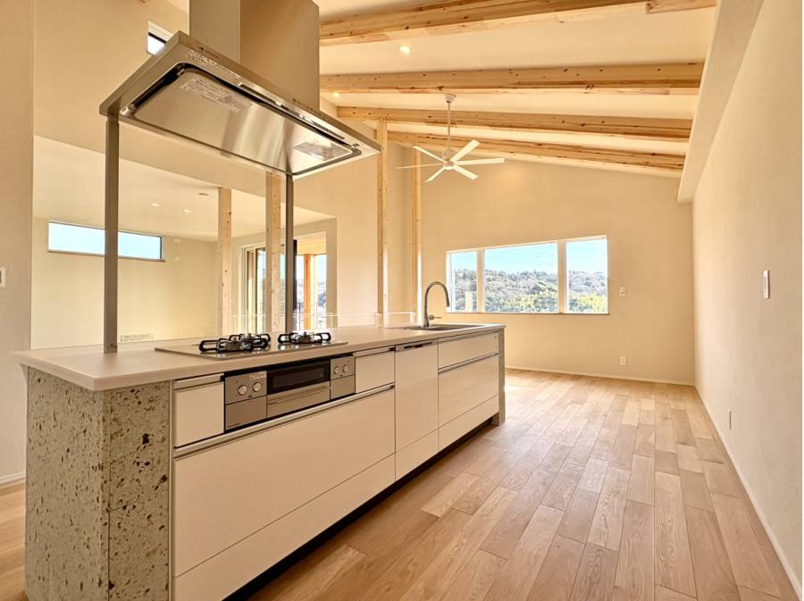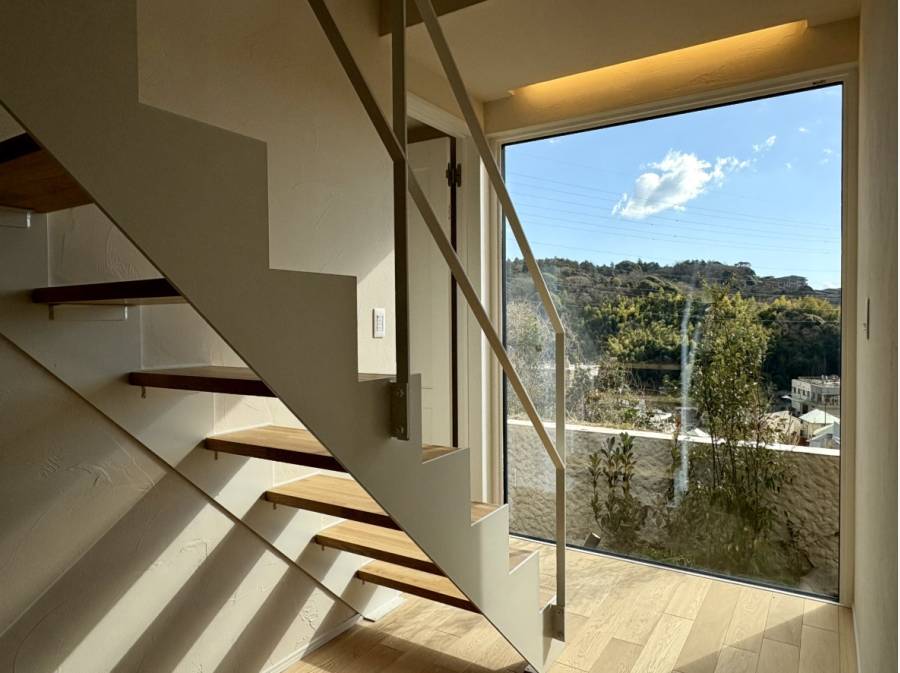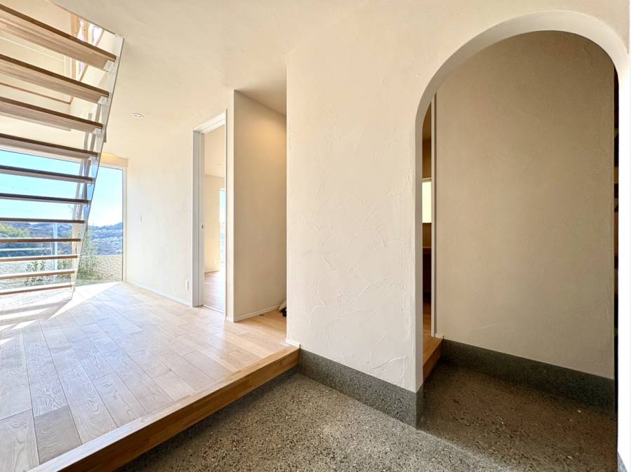 2階リビングの大きな窓からは、空と街並みが広がる開放的な眺めが楽しめます。玄関には土間があり、自然の木材や石を用いた温もりある空間が広がります。