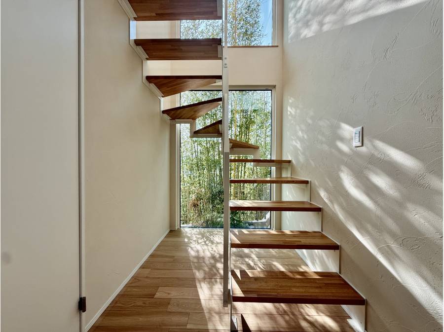 今回ご紹介するのは、その竹林の美しさを借景として取り入れたデザイン住宅です。外観には「屋久島地杉」を用いた木の温かみを感じるウッディースタイルを採用。室内には大谷石や塗り壁、無垢の床材など、こだわりの自然素材が随所に使用されています。