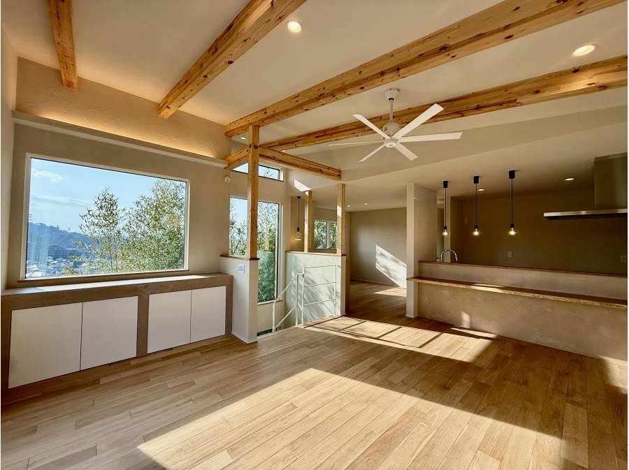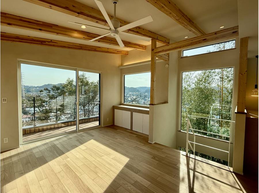 特に目を引くのが、南側に設けられたリビングの大きな開口部。ソファに腰掛けると、目の前に広がる鎌倉らしい風景が心を癒やします。夕暮れ時、木漏れ日が差し込む中で過ごす時間は、まさに心安らぐひとときです。