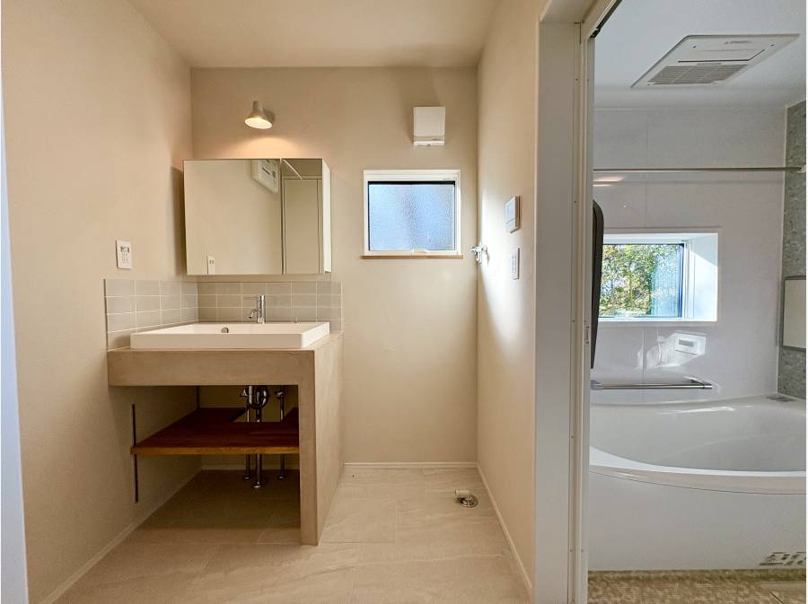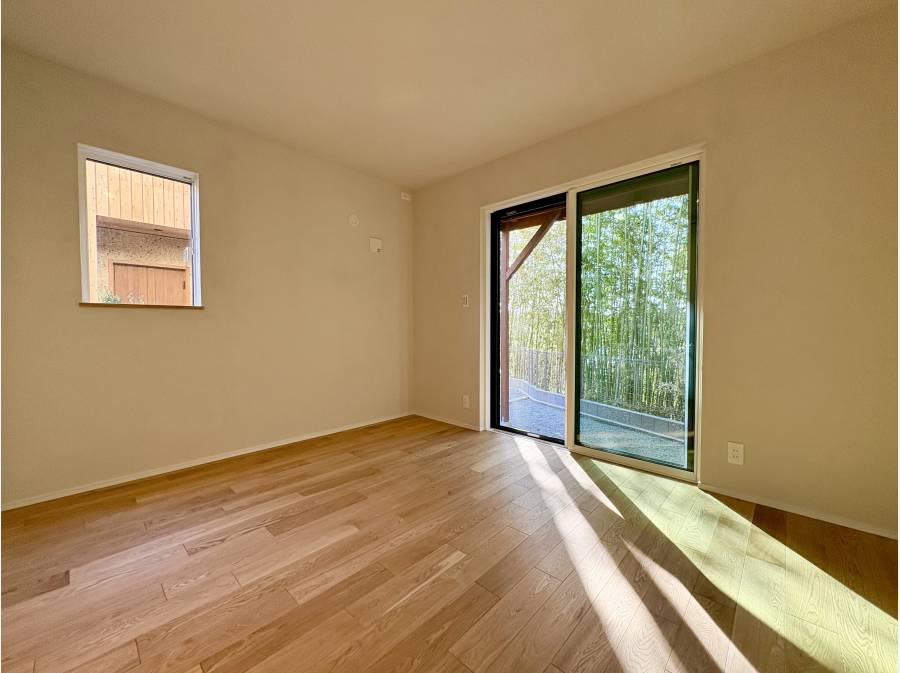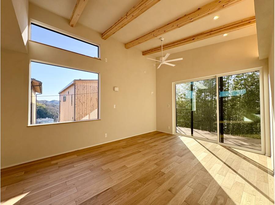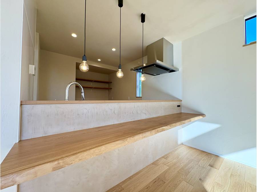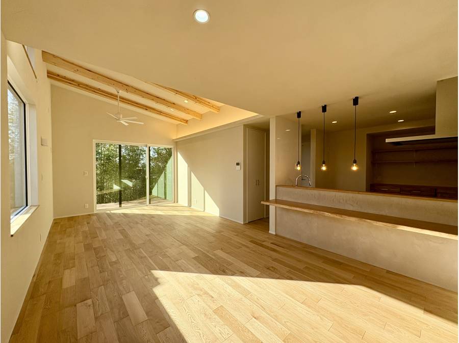 21.5帖の広々としたLDKには、調湿・消臭効果を持つエコウォールや大谷石が天井に施され、床には無垢の突板を採用。外装には耐久性に優れた屋久島地杉を使用し、木の温もりあふれる上質な住空間が広がります。