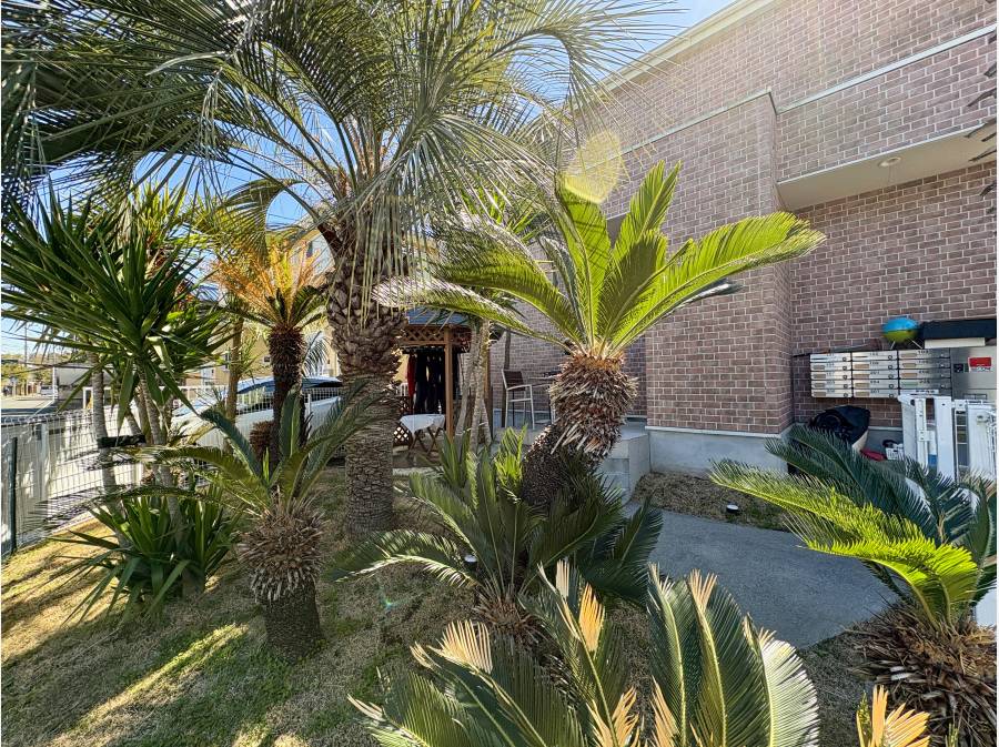 駐車スペースは2台分を確保 。お庭には南国風の植栽と東屋(ガゼボ)があり、リゾート気分を味わえるプライベート空間が広がります 。