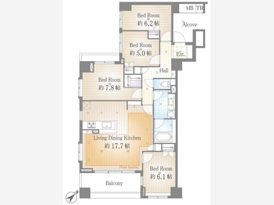 専有面積94.12㎡の広々とした4LDKに加え、0.49㎡のトランクルームも備えられ、収納スペースが充実しています。お部屋は三方角部屋となっており、陽当たりや通風、眺望が良好です。バルコニーからは「パークフロント」の名にふさわしい、緑豊かな景色を楽しむことができます。
