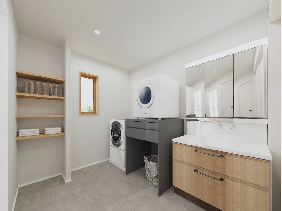 奥行きのあるランドリールームにはガス式乾燥機「幹太くん」を標準装備。