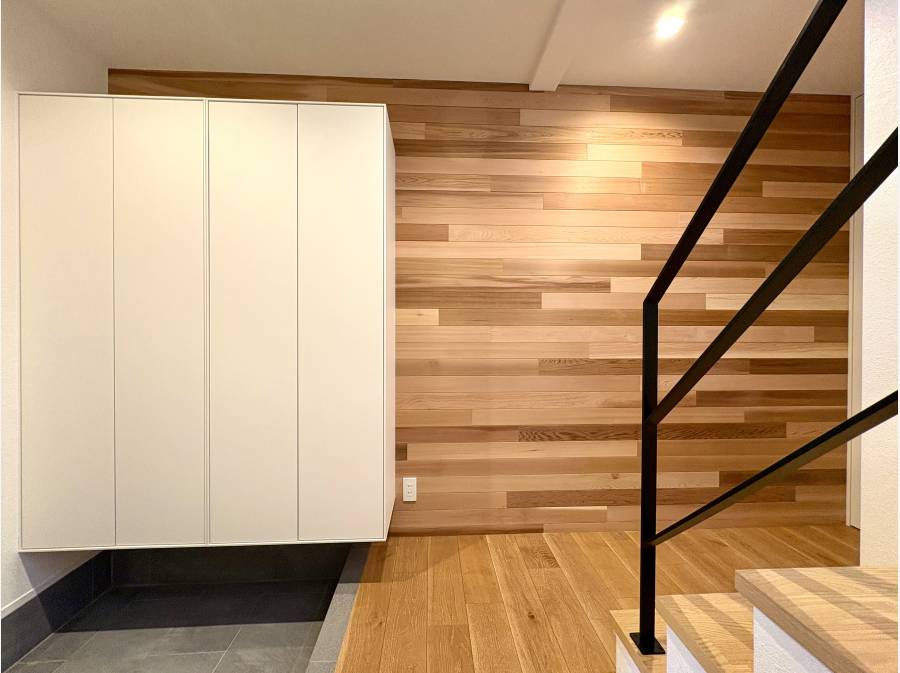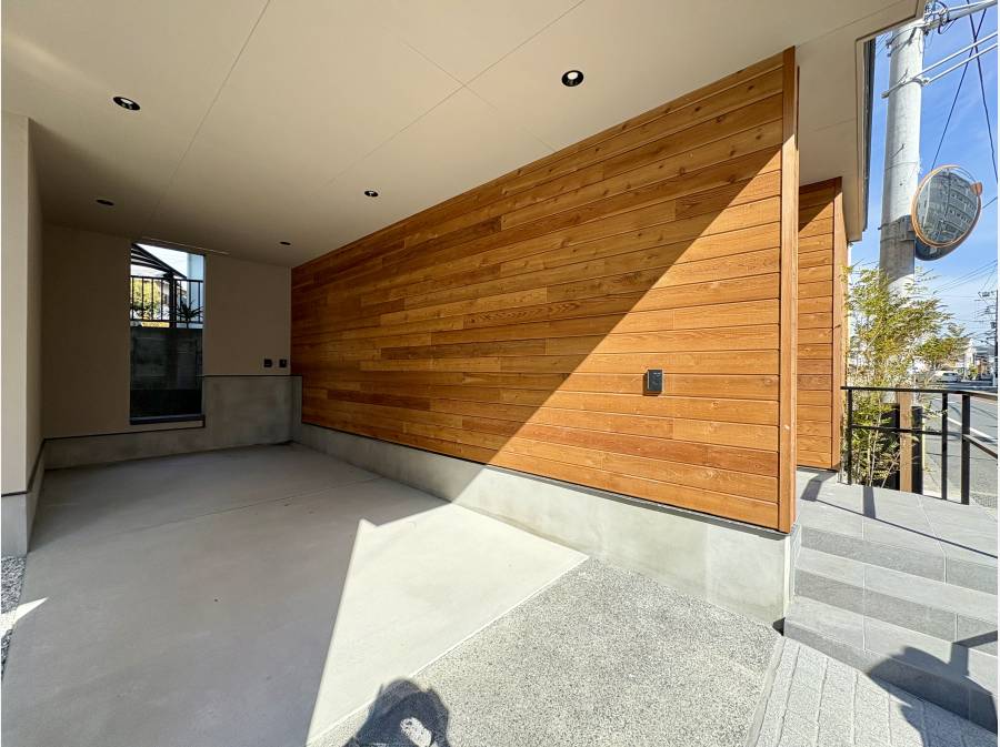 床材や外壁、玄関壁面には突板の天然木を使用し、本物ならではの質感を追求。