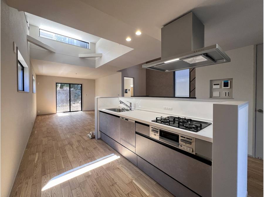 アイランドキッチンを主軸に広がるリズミカルな縦空間。