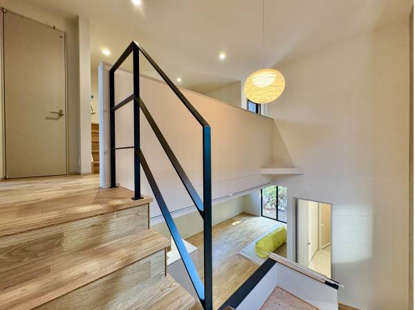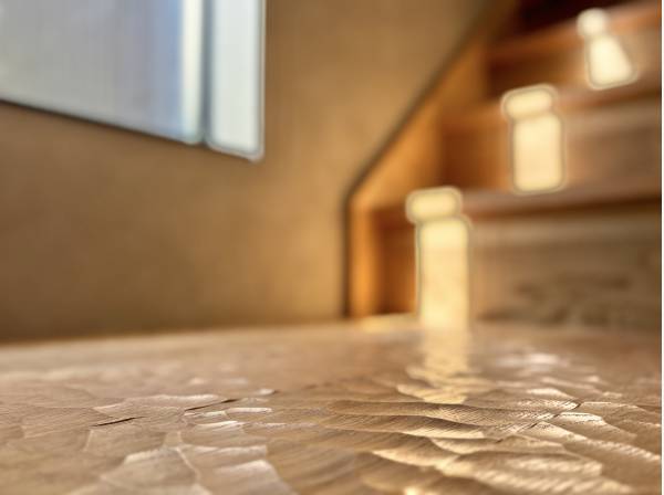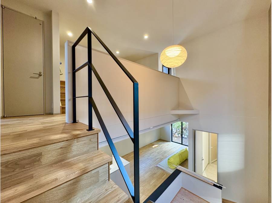 階段の踊り場には「なぐりフローリング」を採用し、随所に上質さを感じさせる仕上がりとなっています。