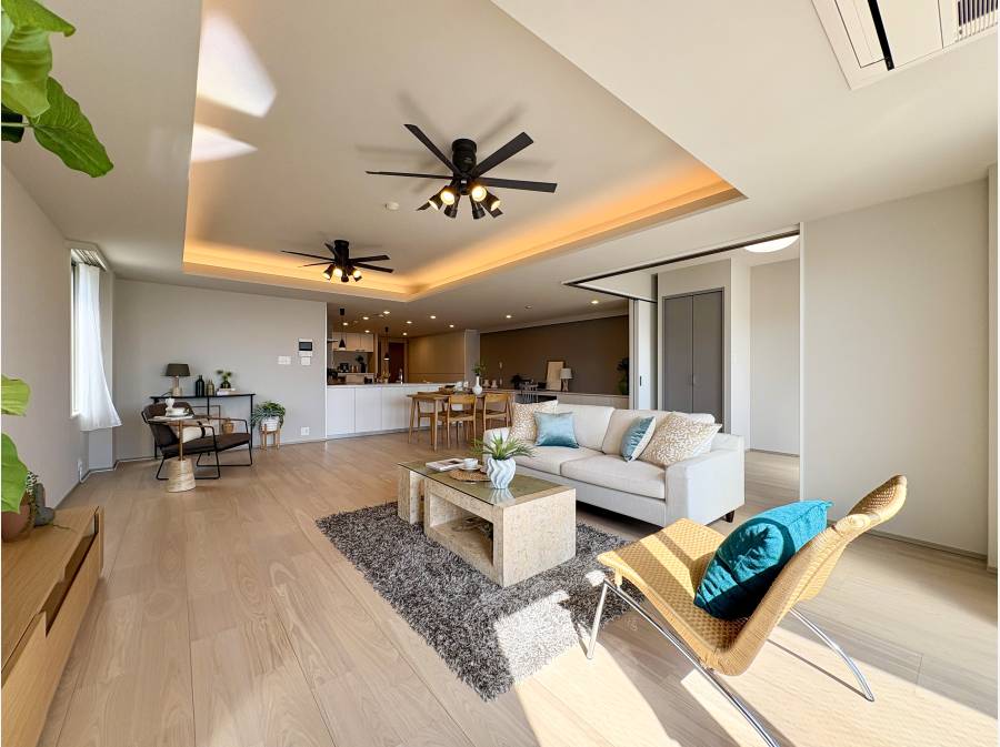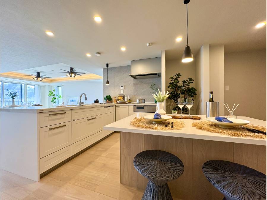 約120㎡の広々とした専有面積を誇り、各部屋にはゆとりがあり、充実した収納スペースもうれしいポイントです。ホールの納戸やアイランドカウンター付きのキッチン、さらにパントリーや食器棚として使える壁面収納など、便利な設備が揃っています。