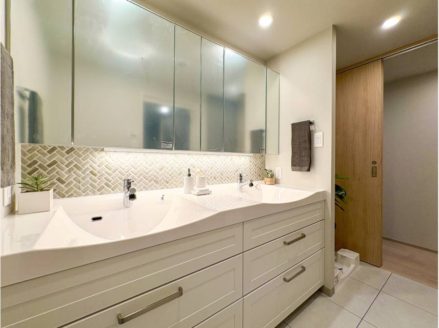 さらに、食洗器付きのシステムキッチンや新しい洗面化粧台、換気乾燥ユニットバス(1620サイズ)、洗浄トイレの交換なども実施。照明器具はシーリングライトやLEDダウンライトに変更し、スイッチ類も新しくしています。