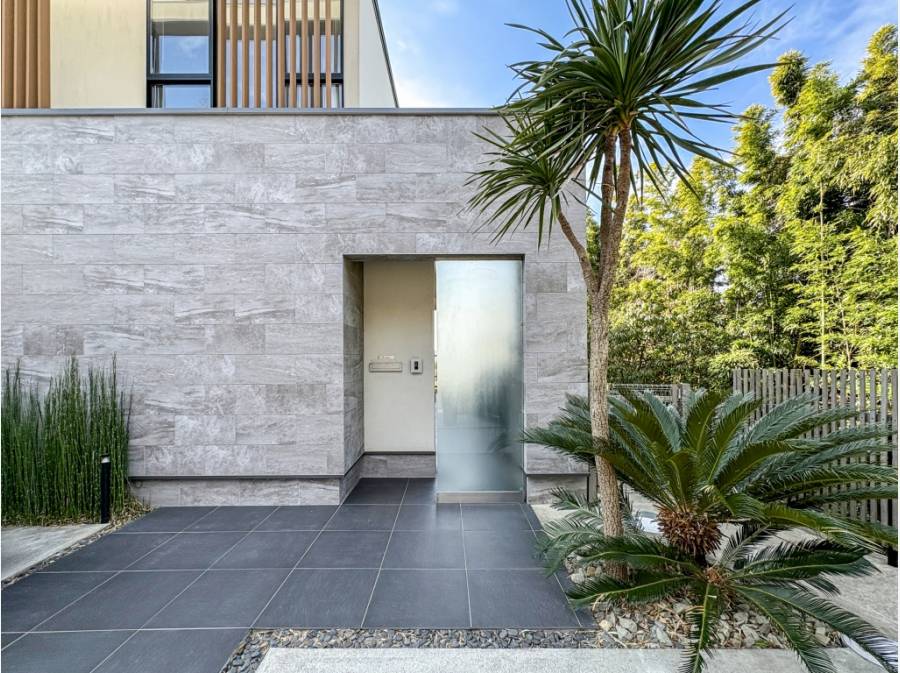 リゾート感のある植栽や重厚なタイルを用いた美しいエクステリア。