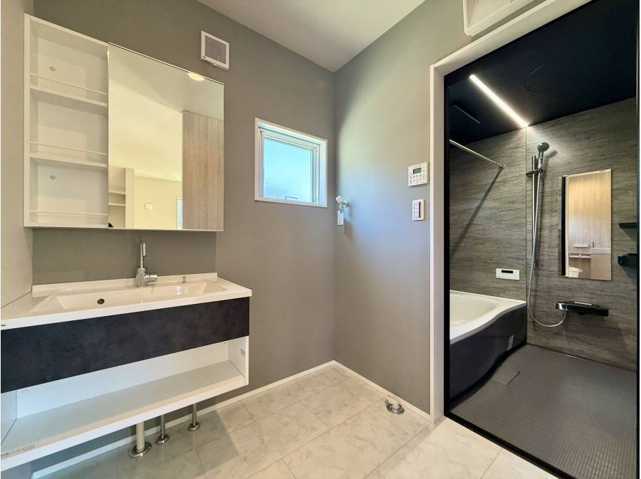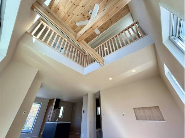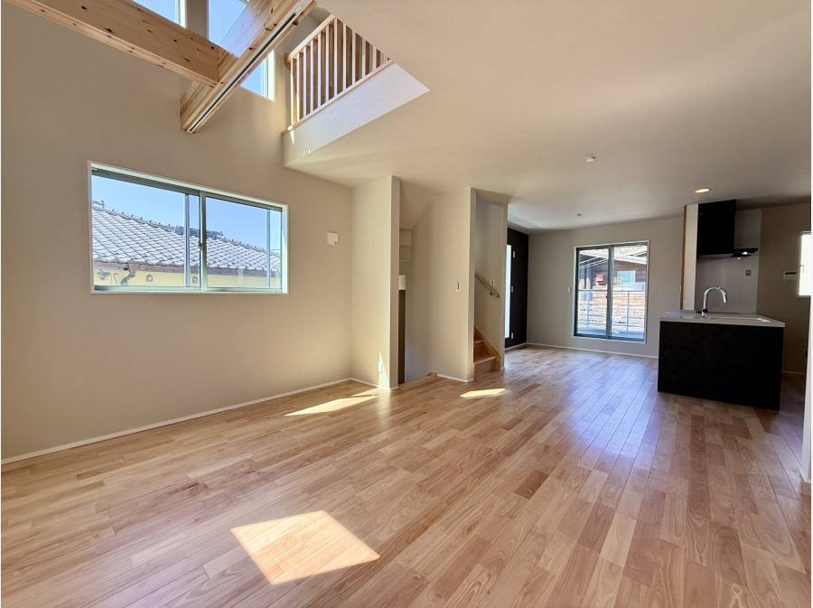 20帖以上の広々としたLDKは、吹き抜け天井で開放感を生み出し、床材には「本桜無垢板」を採用。温もりのある空間が、日々の暮らしに癒しを添えます。