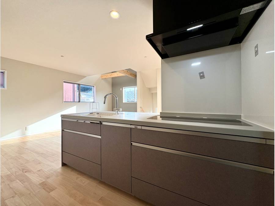 設備面も充実しており、予洗い不要で約9人分を一度に洗えるフロントオープン食洗機や、家事効率を高める3連IHワイドキッチン、スマートフォンからも操作可能な電動シャッターを完備。