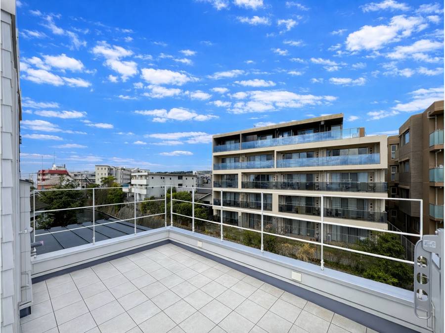 屋上のルーフバルコニーからは、空と街並みの向こうに海を感じる開放的な景色が広がります。晴れた日には、青空と海風を感じながらゆったりとした時間を過ごすことができる特別な空間です。