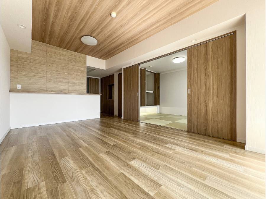 モダンな和室が隣接しており、引き戸を開放してよりゆったりとした寛ぎ空間を愉しむのもおすすめです。