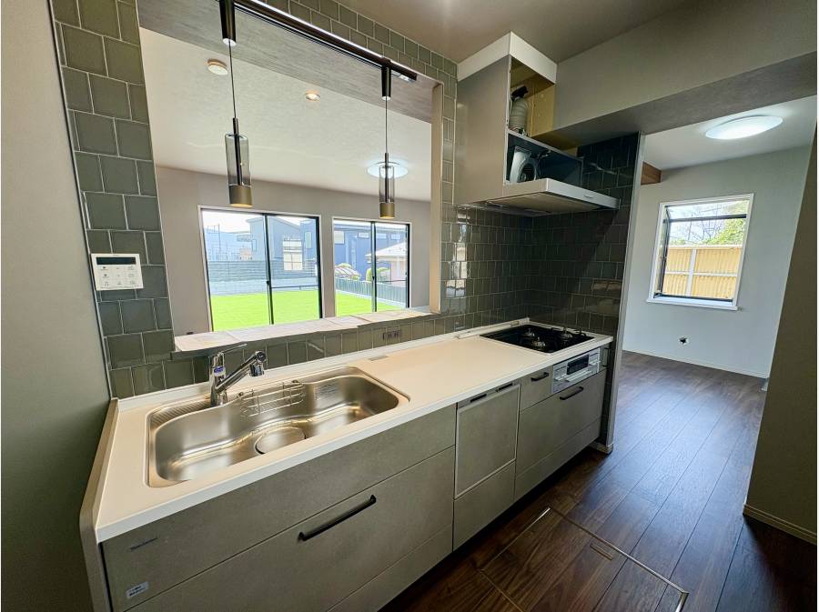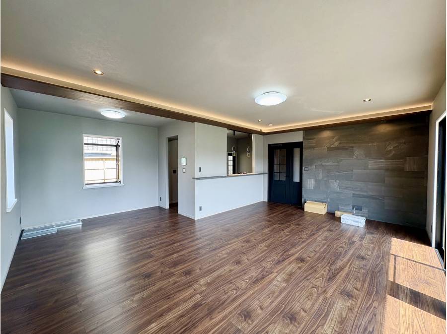 室内は約22.9帖あるLDKが中心となり、家族が自然と集まる空間となっています。最新設備に交換されたキッチンや浴室、一部にレッドシダーを取り入れたデザイン性の高い屋根など、細部へのこだわりが随所に光ります。