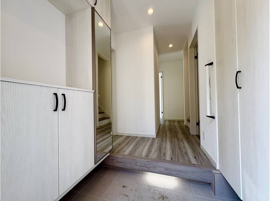 建物は、断熱等級5以上・一次エネルギー消費量等級6に対応した設計で、環境にも家計にも配慮された住まいです。間取りは4LDK。豊富な収納スペースを備え、ウォークインクローゼットやシューズインクローゼットなど、家族の生活動線をしっかりと考えた設計が魅力です。