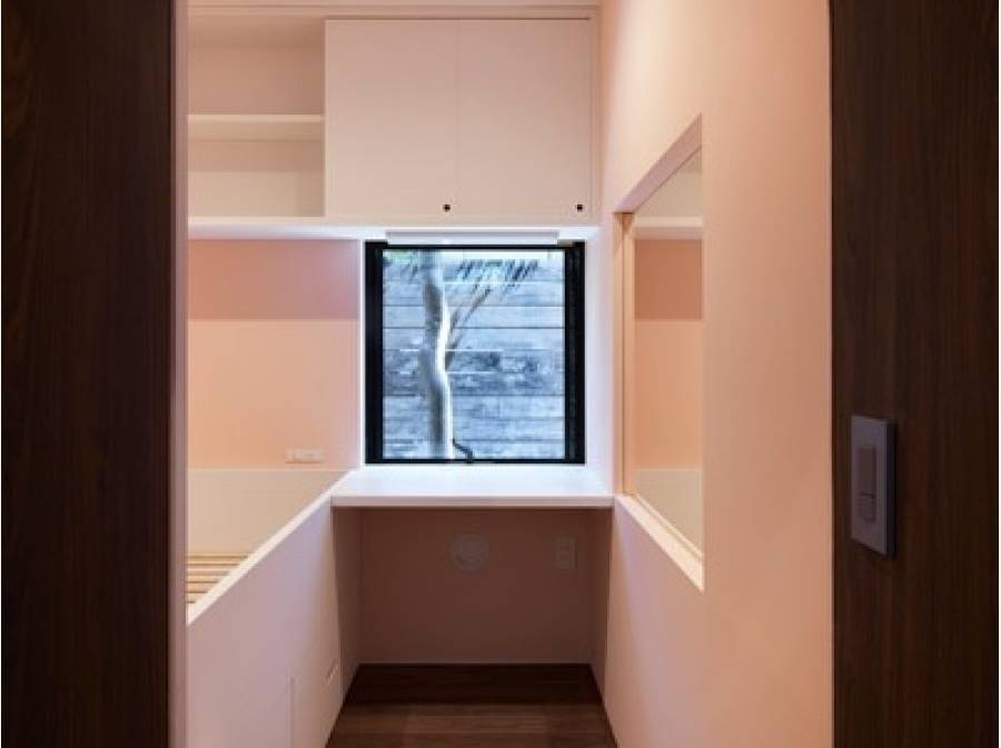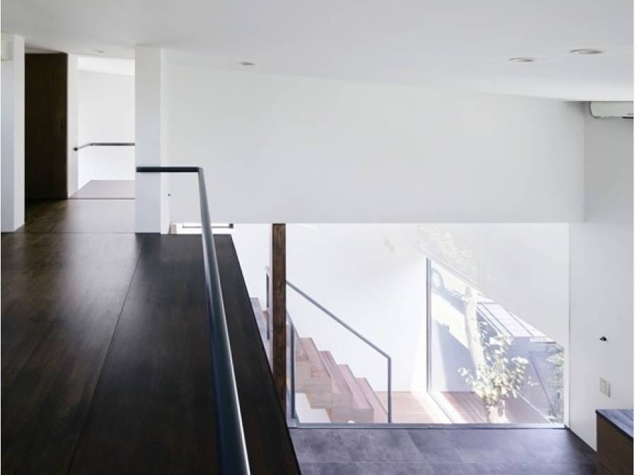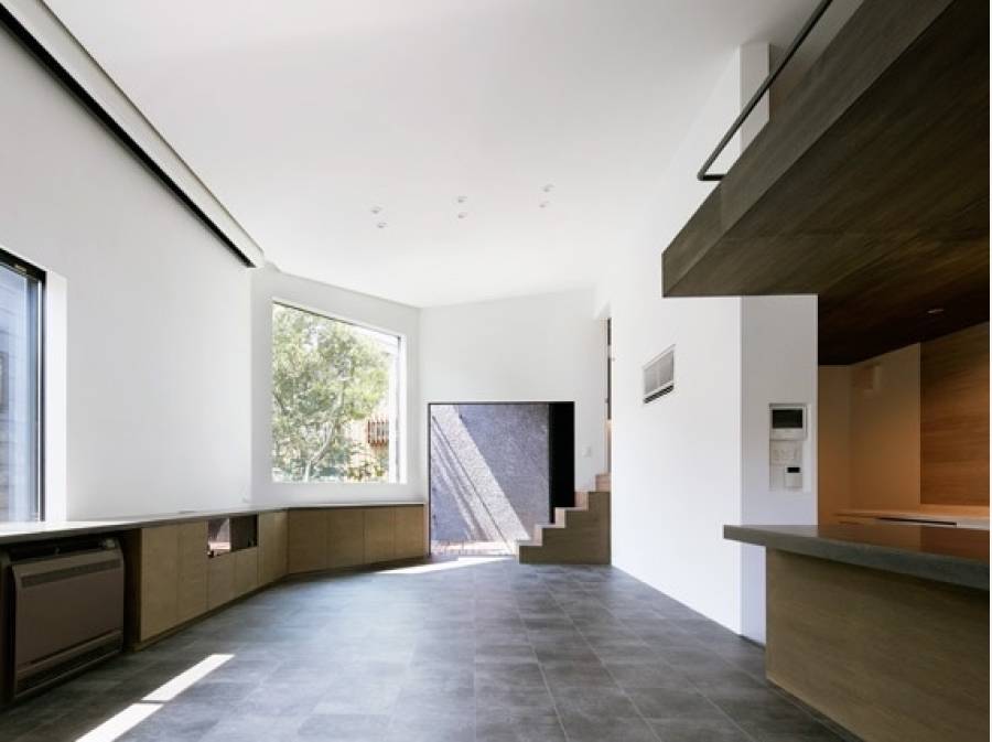 内装は壁をあえて設けず、空間を高低差で緩やかに仕切ることで、洗練された雰囲気を演出しています。LDKには大きな窓があり、そこから差し込む木漏れ日が心地よく、緑に包まれた開放的な住空間が広がります。