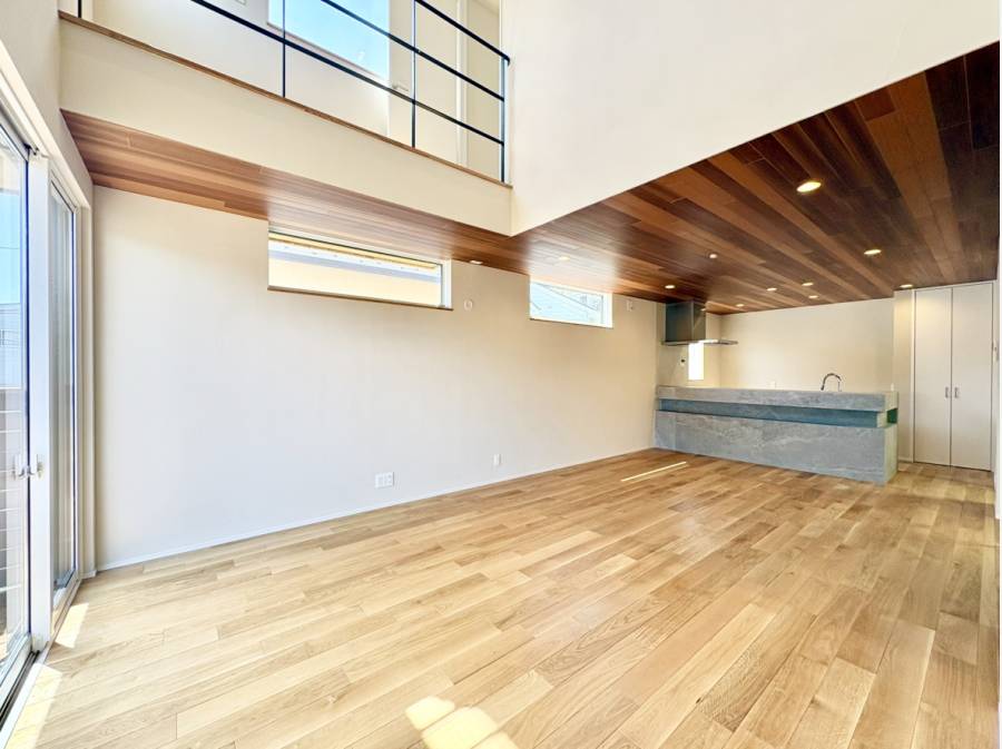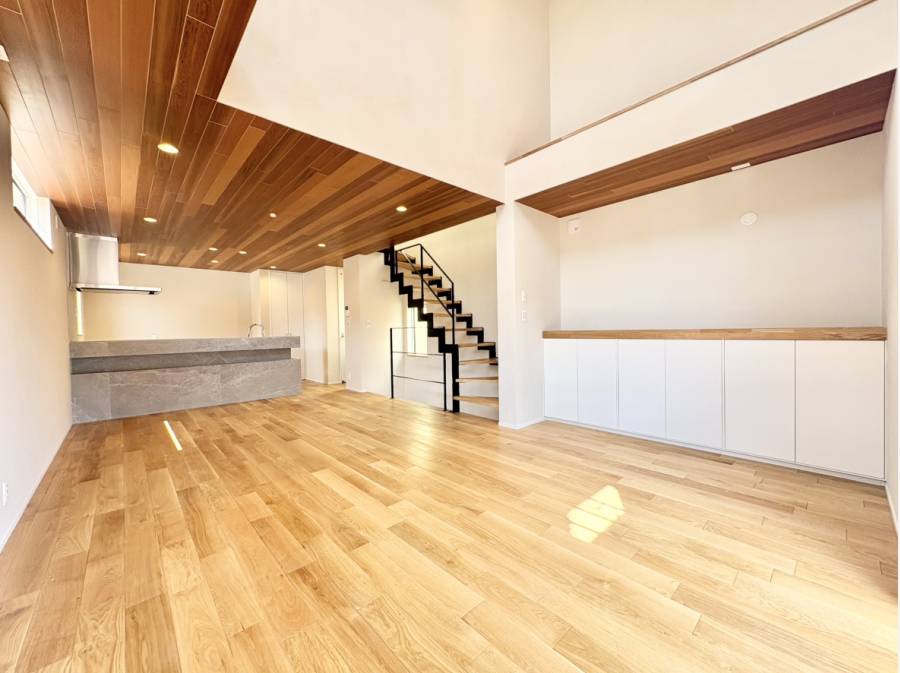 2階リビングは約21.1帖の広さで吹き抜け天井になっており、明るく開放的な空間となっております。