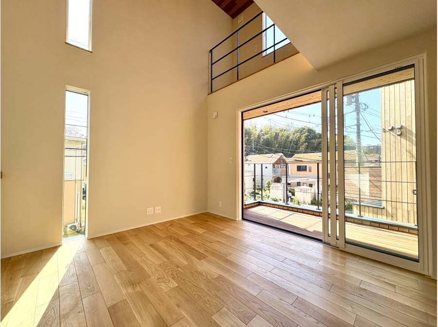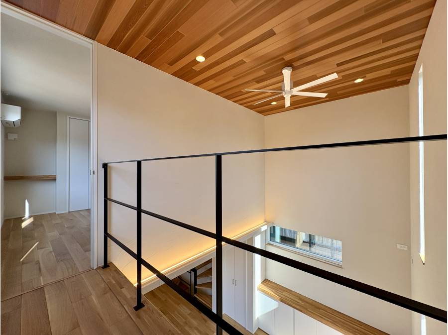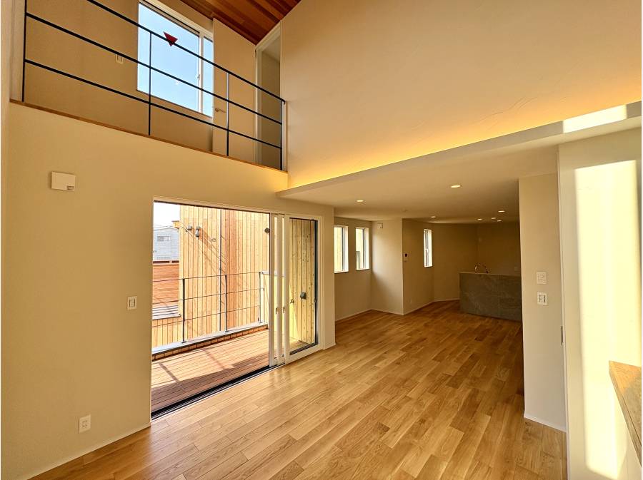 最大の見どころは、光が降り注ぐ2階リビングの吹き抜けと、その空間を横切るキャットウォークです。