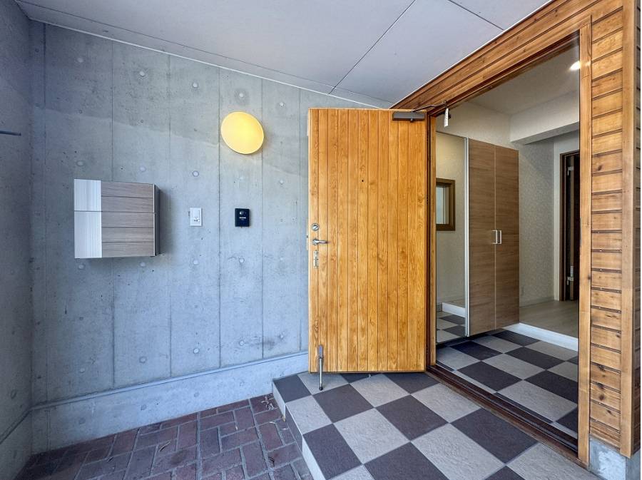 温もり溢れる室内へ誘うブロックチェックの玄関ポーチ。