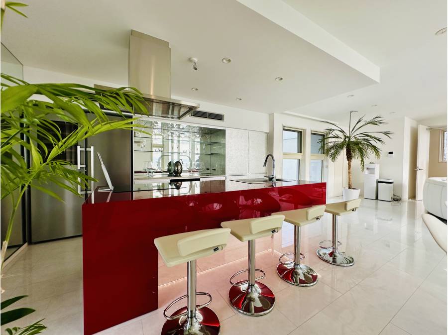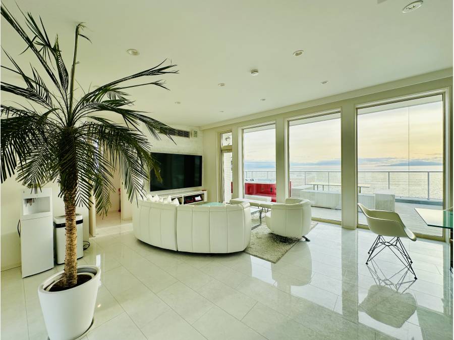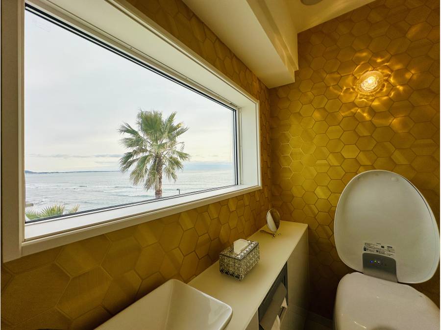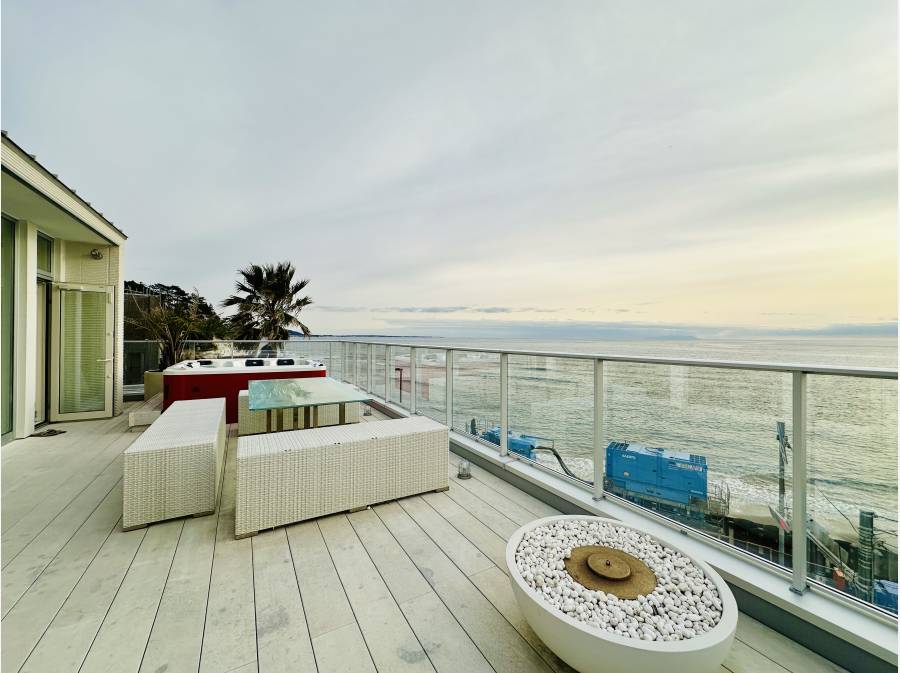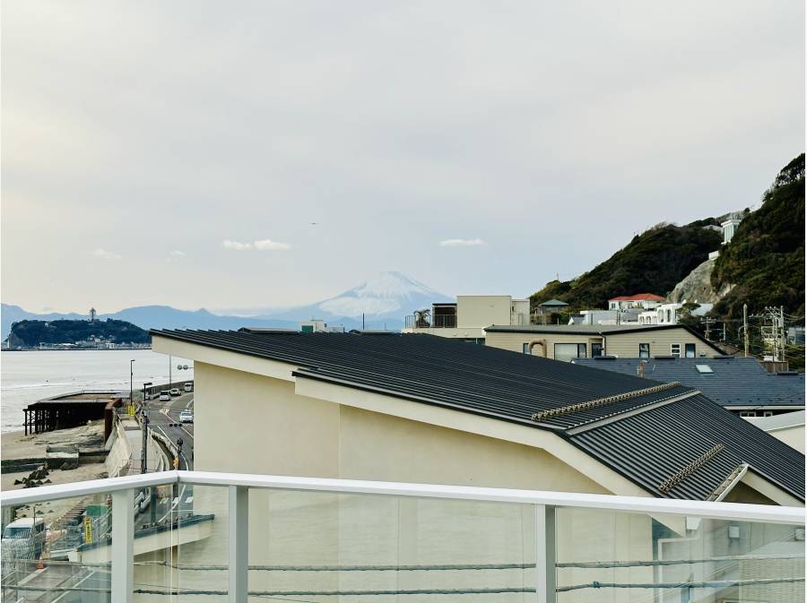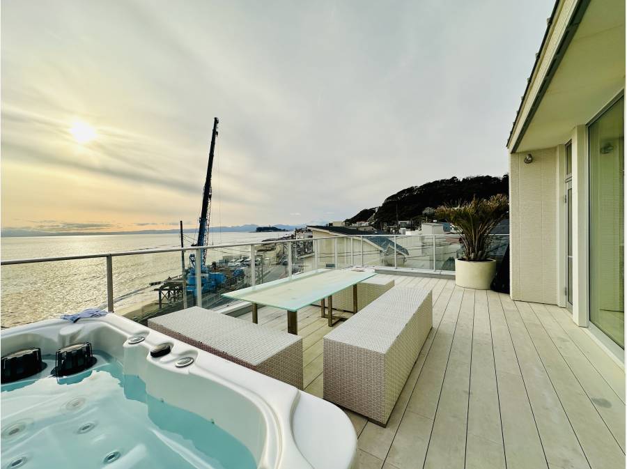 3階には約33.7帖の広々としたLDKがあり、バルコニーには5人用のジャグジーを配置。ここからは稲村ガ崎の海、富士山、江ノ島を一望できます。特にサンセットタイムには、刻々と移り変わる景色と波の音を楽しみながら、贅沢なひとときを過ごせるでしょう。