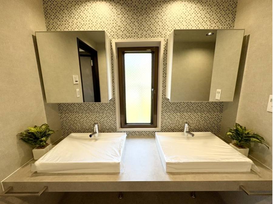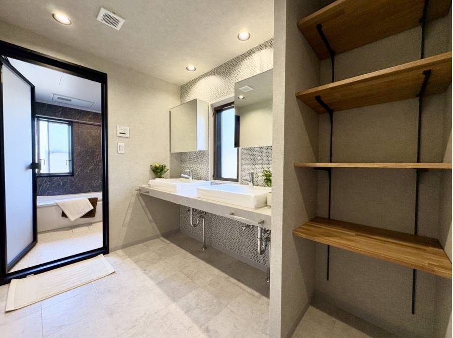 アクセントウォールが映えるスタイリッシュなリビングは、ゆったり過ごせる広さを確保しました。パウダールームには、「2ボール洗面台」を設置。細部までこだわり抜いたモダンな空間に仕上がっています。