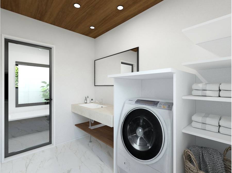 キッチンは特注色のブラックシダー面材を採用したタカラスタンダード製で、バーカウンターやワイングラスラックなど大人向けの機能が充実しています。家事効率を考えた設計も見逃せません。幅1,350mmの広々とした洗面台や使いやすいランドリールームが配置されています。
