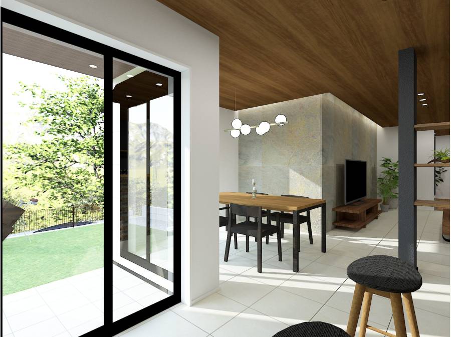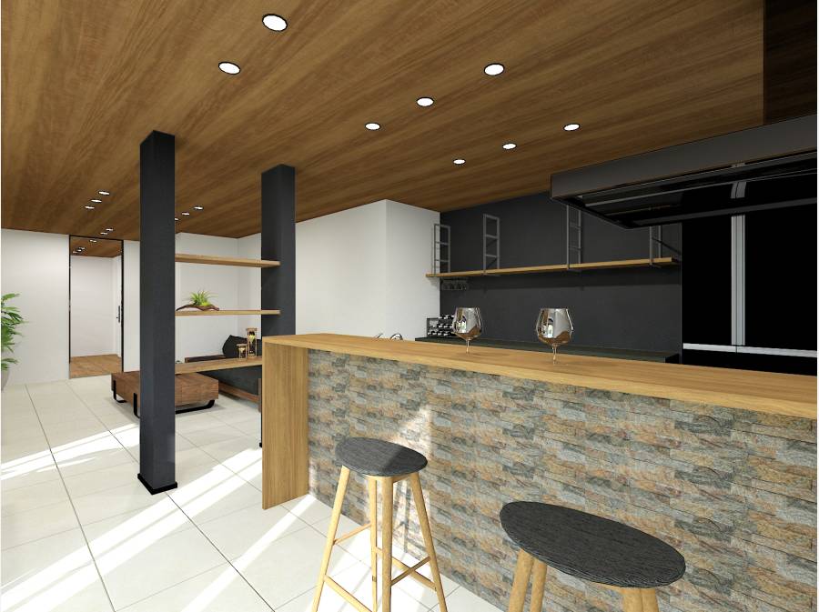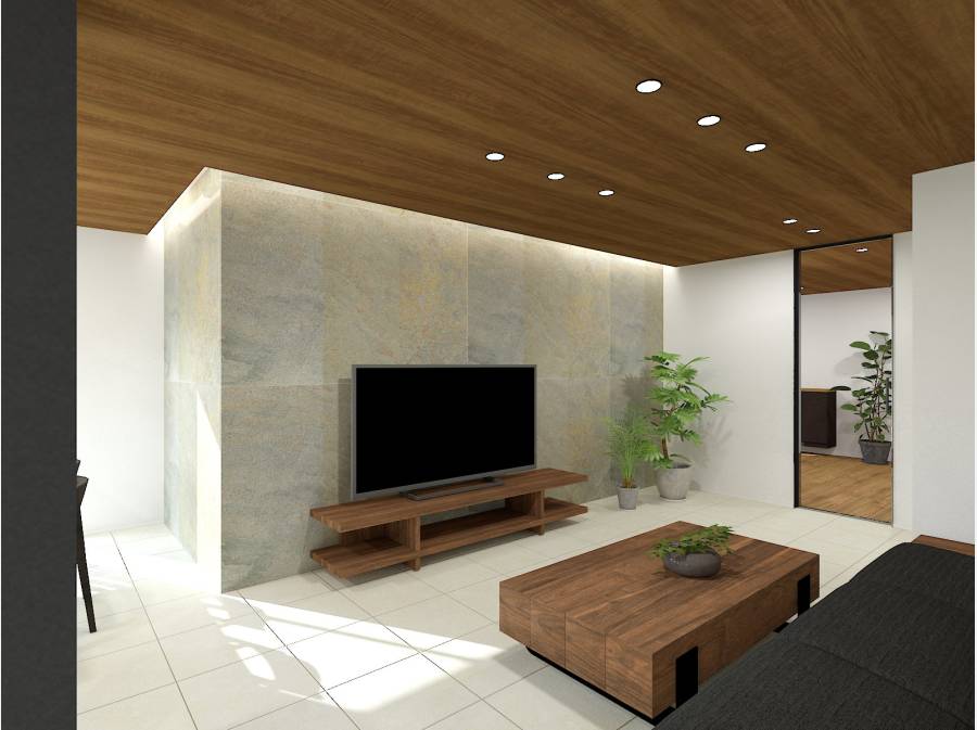 この物件の魅力は、素材をふんだんに取り入れた空間設計です。1階のLDKは南向きで約24.1帖の広さを確保し、テレビ背面やキッチン擁壁には海外製の天然石タイルを使用。さらに、間接照明や木目調の天井が落ち着いた雰囲気を演出しています。