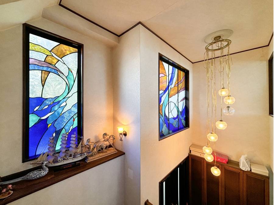 両開きの玄関ドアをくぐると、広々とした吹抜けの玄関ホール、鮮やかなステンドグラスが明るい気持ちにさせてくれます。