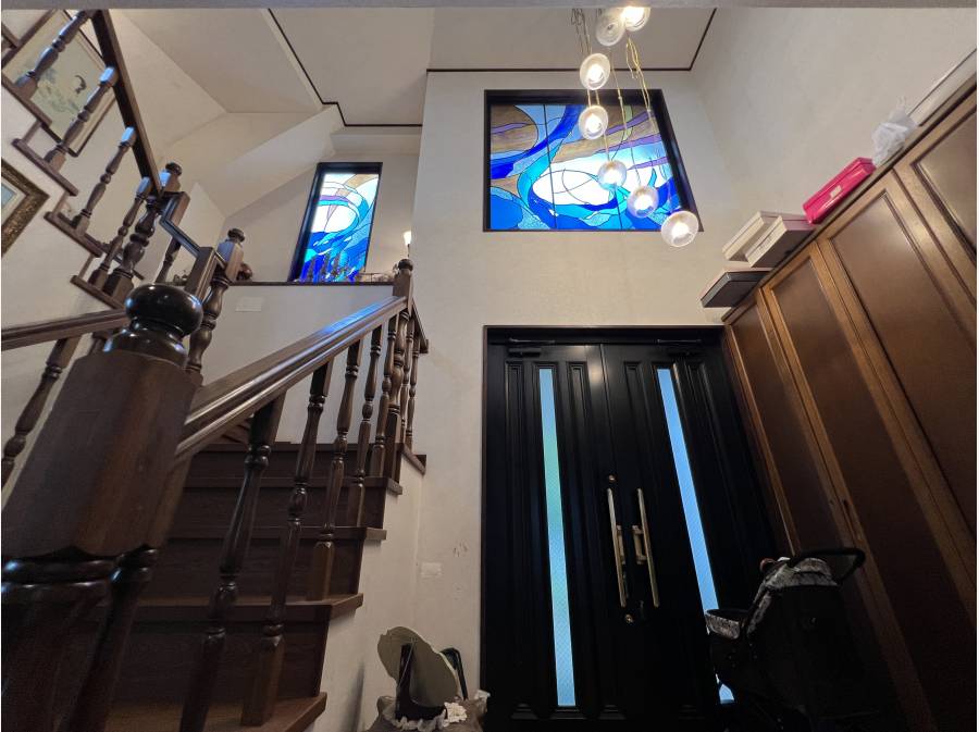 吹き抜けの玄関に、美しいステンドグラスが施された