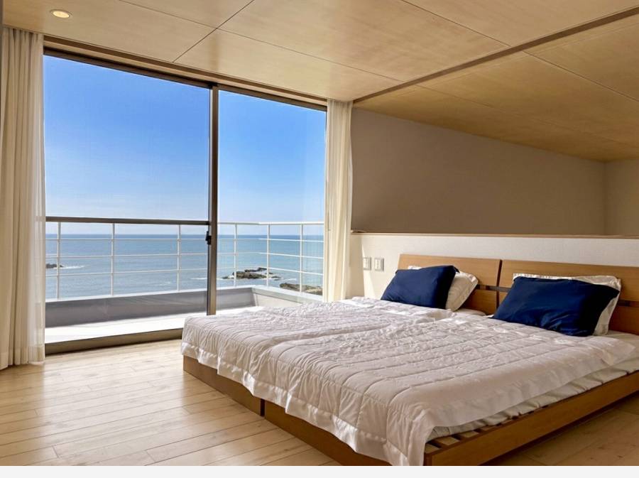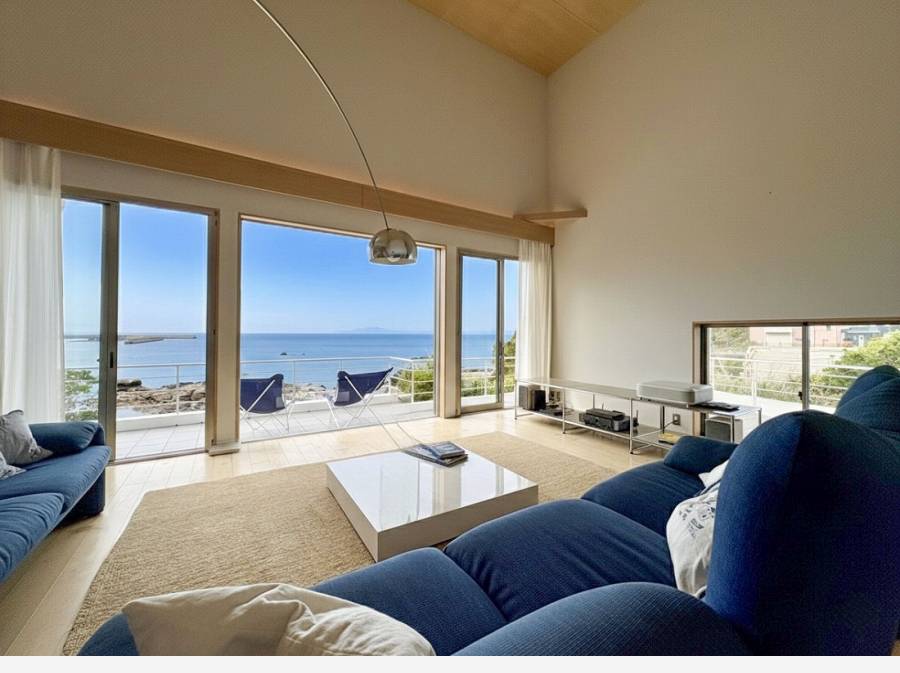 高天井の開放感溢れる約30帖のLDKは、お部屋のどこにいても海を感じられる贅沢な空間。