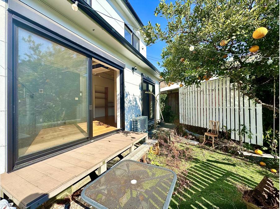 リビングの大きな窓を開け放つと、ウッドデッキと芝の緑が自然につながり、季節の光や風をそのまま暮らしに取り込む住まいです。