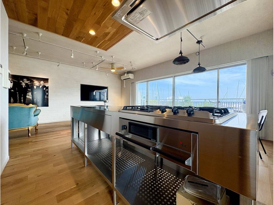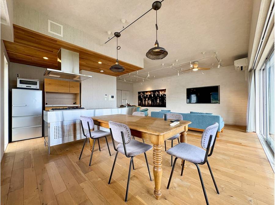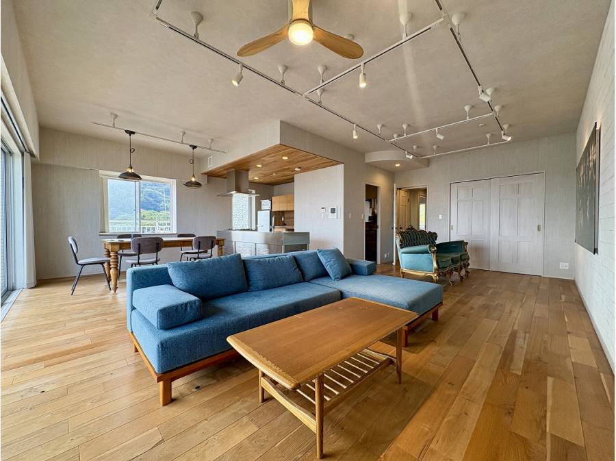 眺望・浮遊感・3方向からの採光がもたらすエアリーな雰囲気をベースにナチュラルな素材で造り上げたリゾート感のあるインテリア。